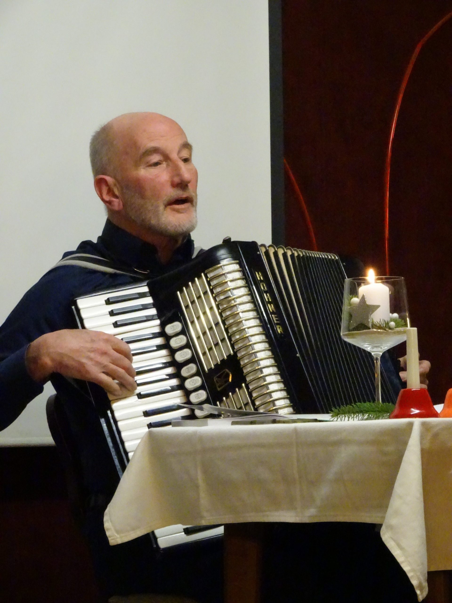 Besonders gut besucht war heuer unsere Adventfeier, die im Gasthaus Pieringer in Loizersdorf stattfand. Für die Gestaltung des besinnlichen Teils konnten wir den Straßkirchener Kulturpreisträger Manfred Bauer gewinnen, der aus seinem kürzlich erschienenen Buch „Vom Finstern ins Liacht“ nachdenklich stimmende, kritische und humorvolle Geschichten und Gedichte vorlas sowie selbst komponierte Lieder mit Texten befreundeter Autoren, begleitet auf dem Akkordeon, zum Besten gab. Engagiert sangen die anwesenden Mitglieder bei bekannten Liedern mit, und für besondere Begeisterung sorgte „Alle Jahre wieder“, das spontan ausgewählte „Musikanten“ unter dem Dirigat Bauers auf Glocken zu Gehör brachten. Man war sich einig, diese Adventfeier war ein gelungener Abschluss des Vereinsjahres.